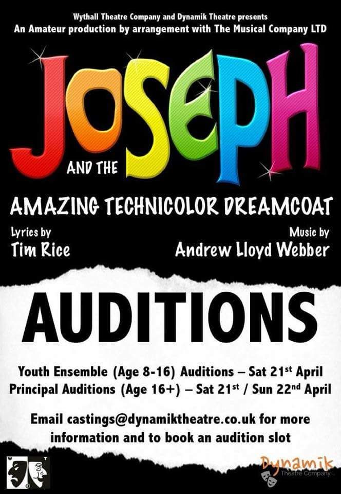 Wythall Theatre Company and Dynamik Theatre Company are pleased to announce that it will be holding auditions for the Tim Rice and Andrew Lloyd Webber musical Joseph and the Amazing Technicolor Dreamcoat.