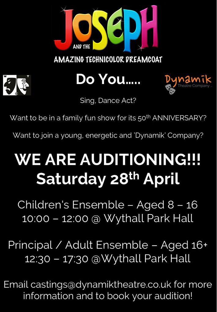 Wythall Theatre Company and Dynamik Theatre Company are pleased to announce that it will be holding auditions for the Tim Rice and Andrew Lloyd Webber musical Joseph and the Amazing Technicolor Dreamcoat.