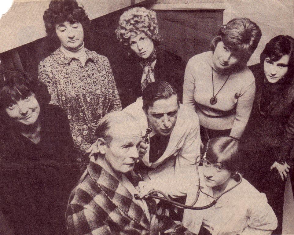 Press photograph for Edward and George (source unknown). "Members of the Wythall Amateur Dramatic Society rehearsing on the two plays they are presenting at The Woodrush High School on November 2, 3 and 4. This scene from "George" includes, back row (right to left) Julia Tipten, Ann Cope, Pam Davey, Sybil Parr and Val Archer. Front, Jack Parramore is being tended by "Doctors" Bob Aldridge and Willa Hislop."
