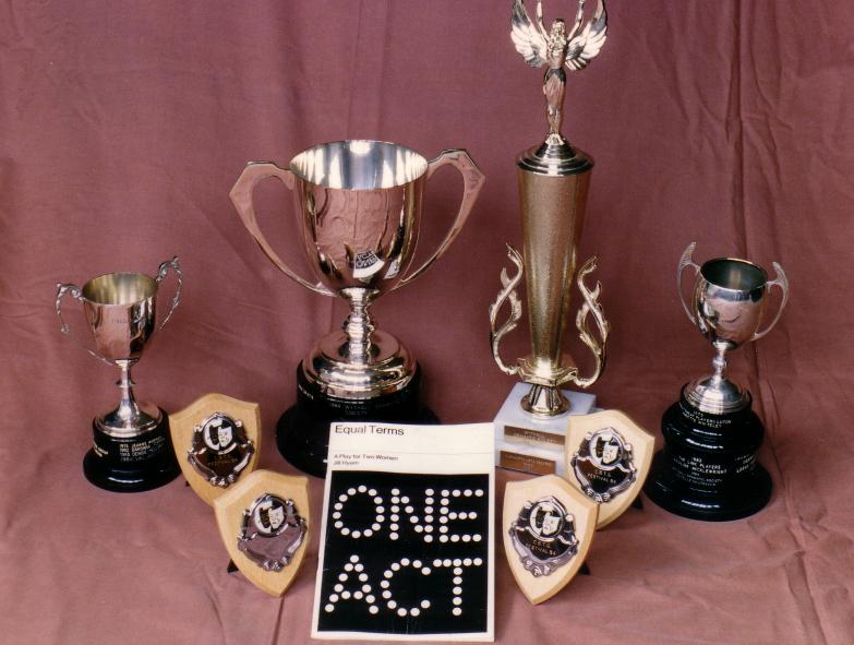 The Wythall Dramatic Society scooped four awards with their production of "Equal Terms" by Jill Hyem, directed by Gerry Solomon. The cast of Val Archer and Estelle Shutkever were awarded the George Evans Cup (Runners up, best overall production), the Alpha Trophy for the best all Womens Team, the Whateley Cup for best actress (Estelle Shutkever) and the Presidents Cup for best supporting performance (Val Archer).